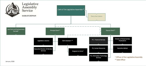 The Clerk, in her direction and leadership of the Legislative Assembly Service, is assisted by an Executive Team and a Leadership Team, which are comprised of division heads and senior leaders in communications, finance, human resources, information technology and legal services.